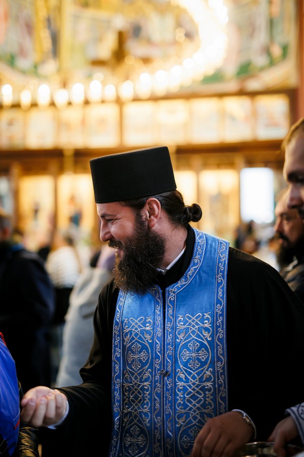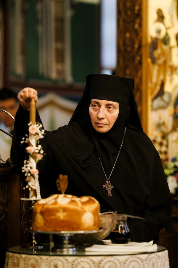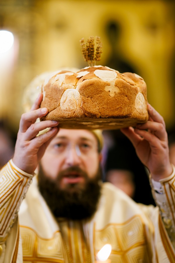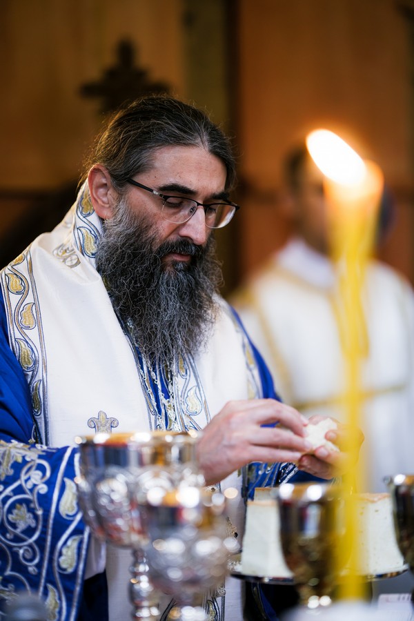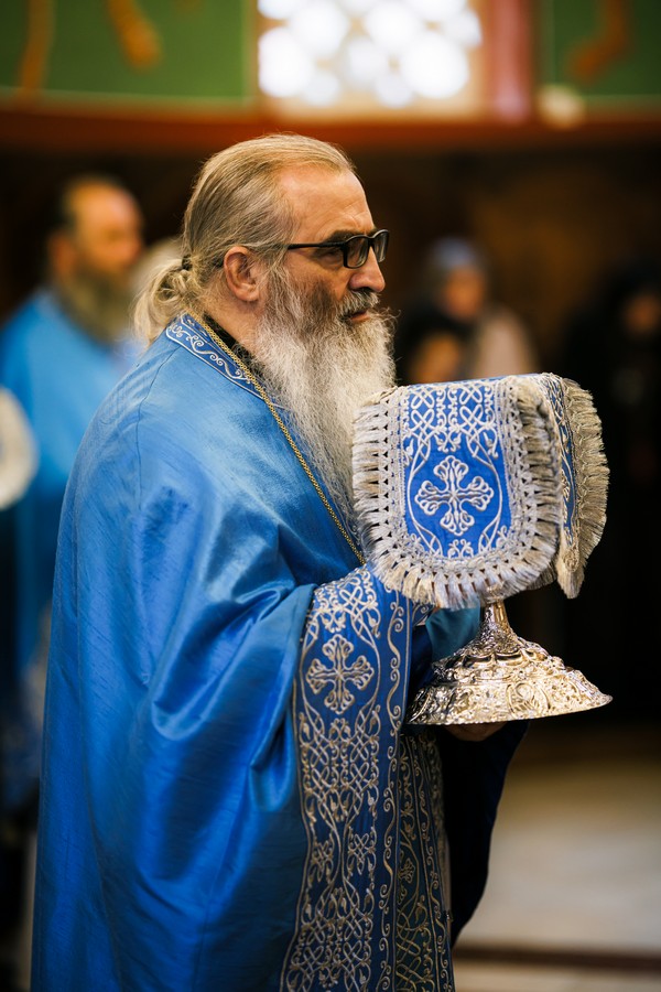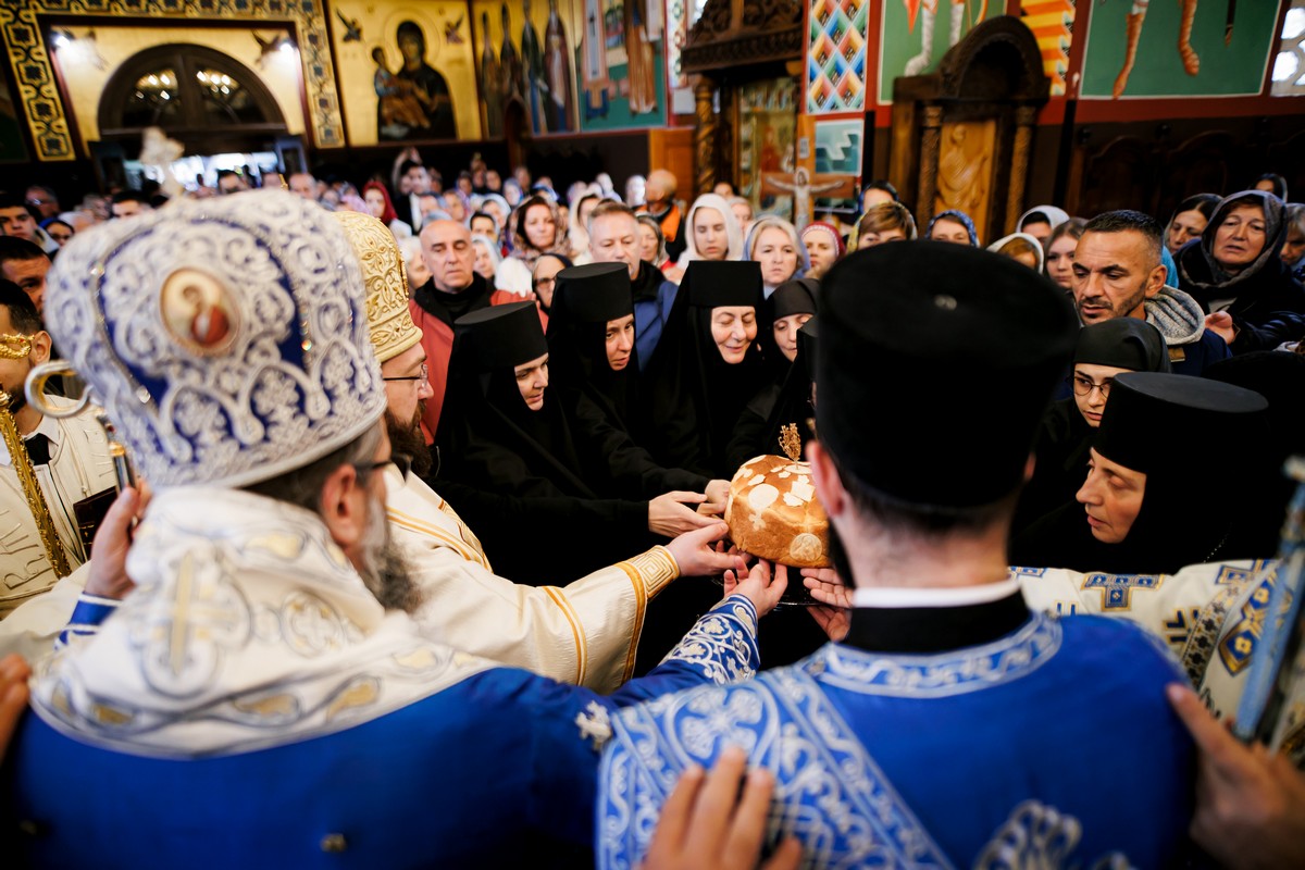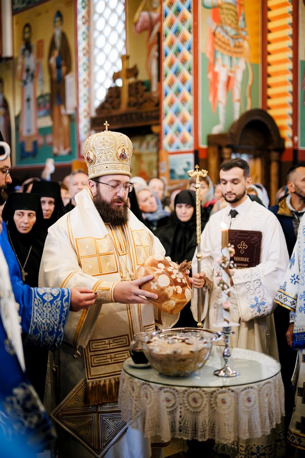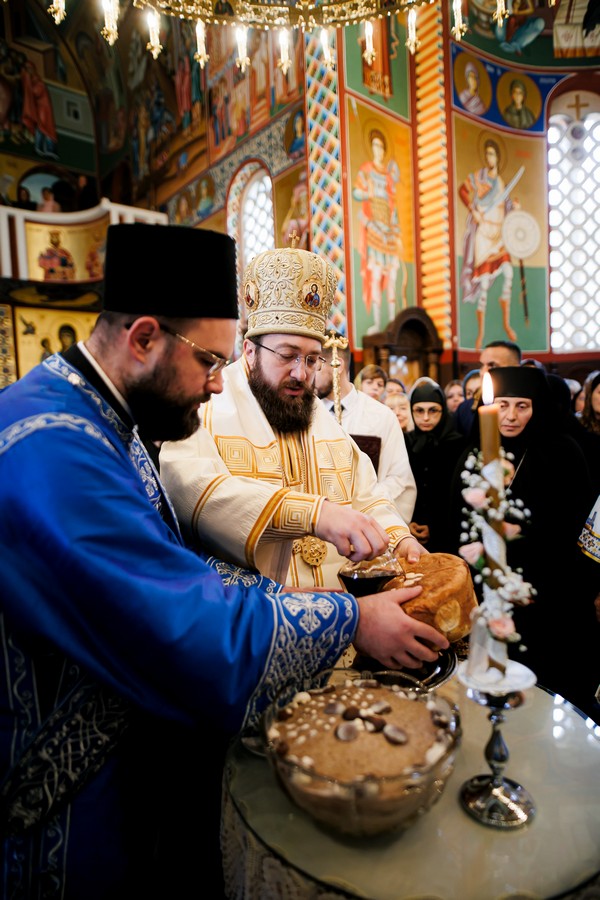 Након заамвоне молитве, Преосвећени Владика Нектарије осветио је славске дарове и пререзао колач, припремљен поводом славе ове свете обитељи.