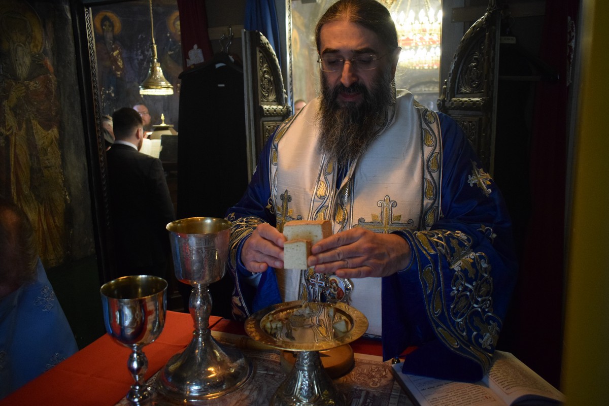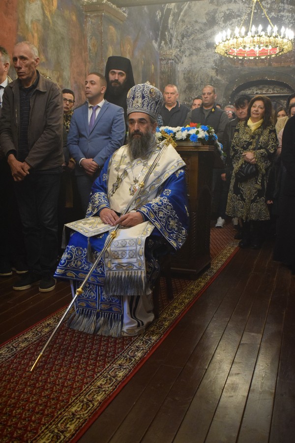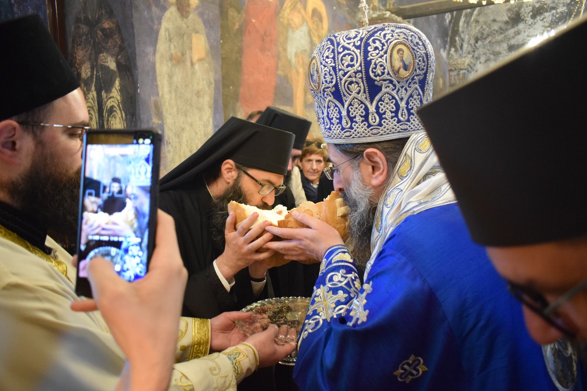 Након заамвоне молитве, Високопреосвећени Митрополит је осветио славске дарове и пререзао колач, припремљен у славу и част Пресвете Богородице, чије Благовештење овога дана Света Црква свечано прославља.