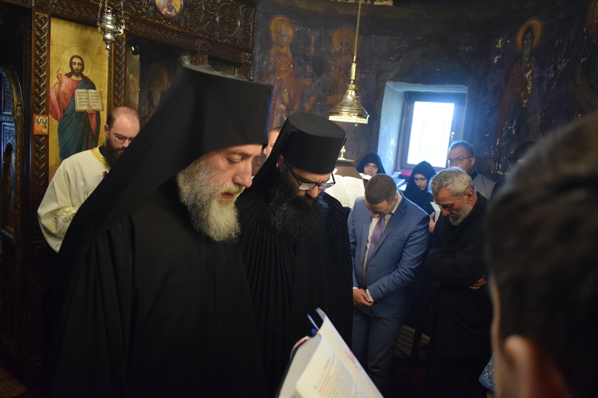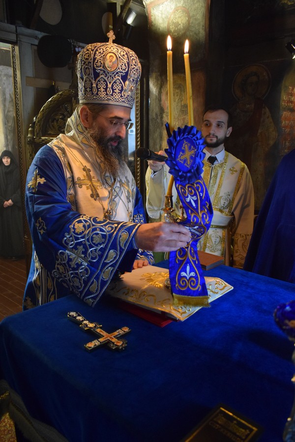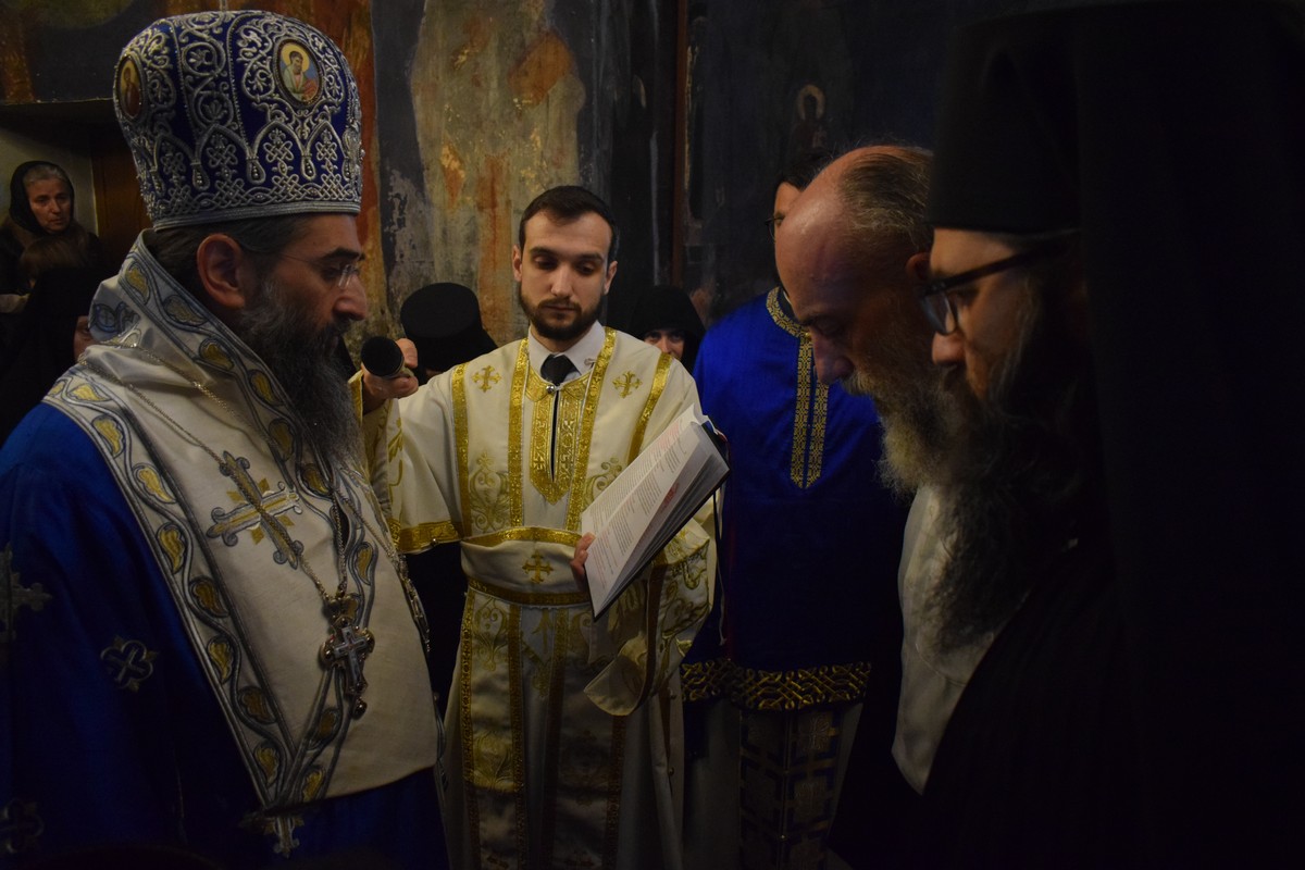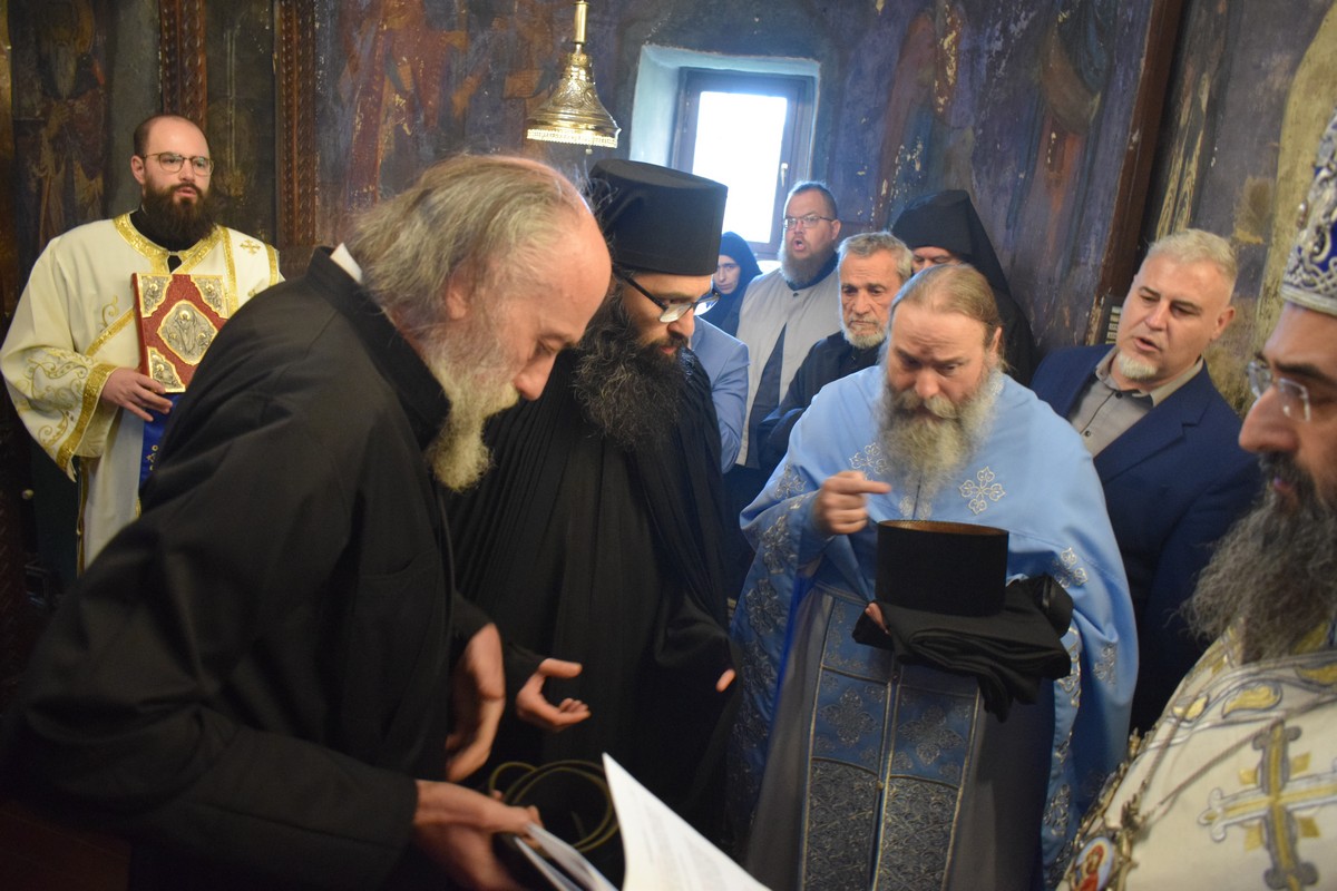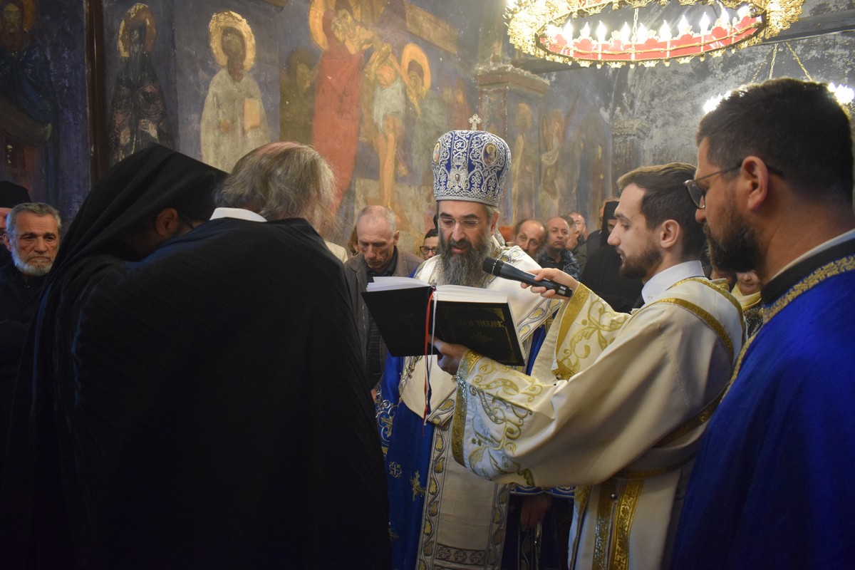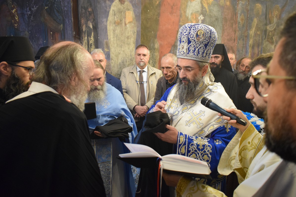На Малом входу овог литургијског сабрања, које почиње вечерњом службом, Високопреосвећени Владика је, по чину одевања расе и камилавке, у монашки чин увео искушеника ове свете обитељи Радомира, који је, благословом Његовог Високопреосвештенства, понео име Агатон.