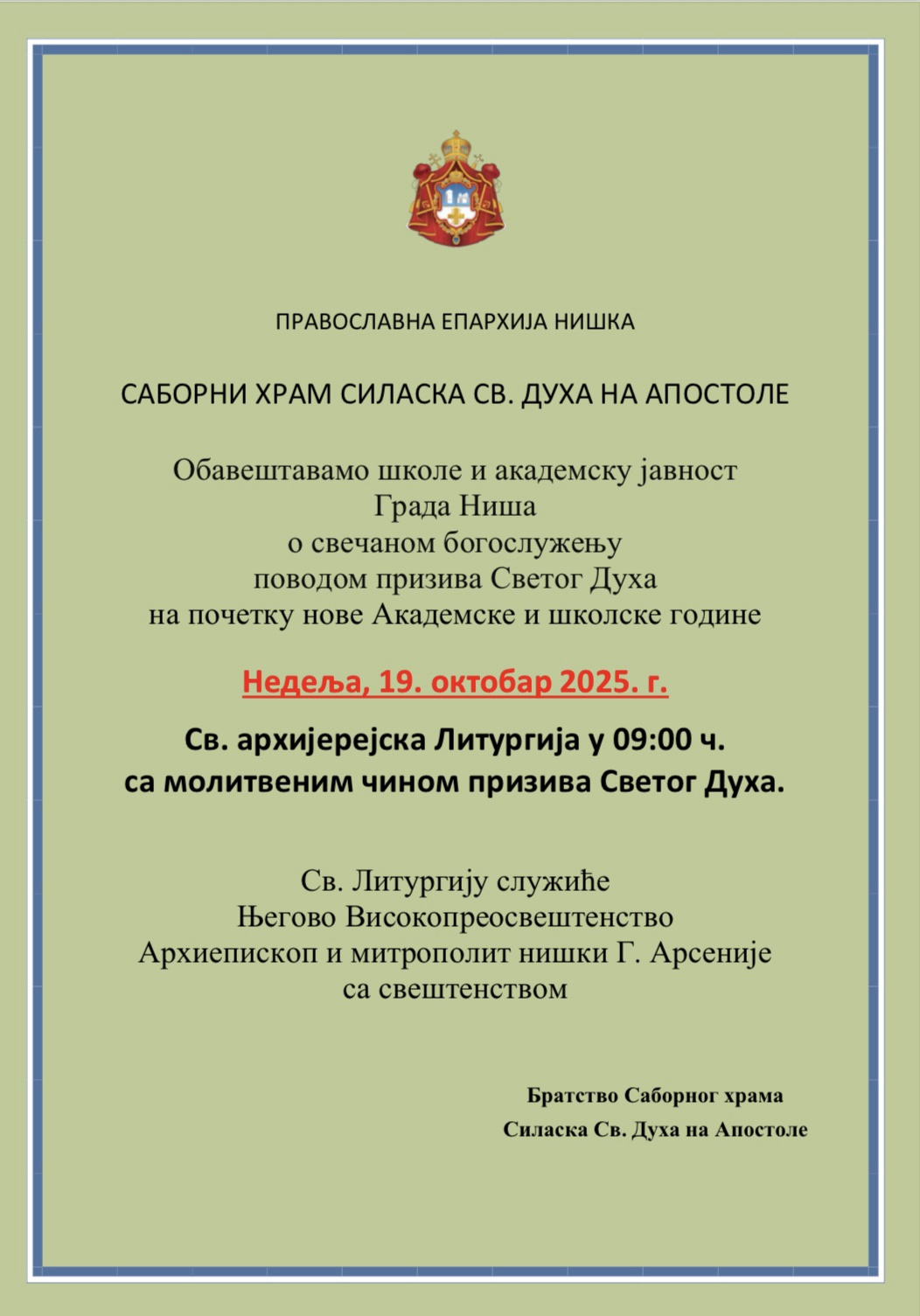 НАЈАВА ЗА ПРИЗИВ СВЕТОГА ДУХА НА ПОЧЕТКУ НОВЕ АКАДЕМСКЕ И ШКОЛСКЕ ГОДИНЕ У НИШКОМ САБОРНОМ ХРАМУ