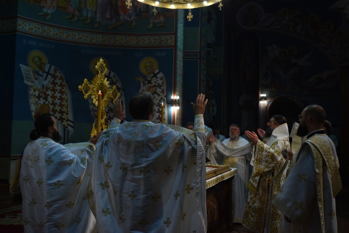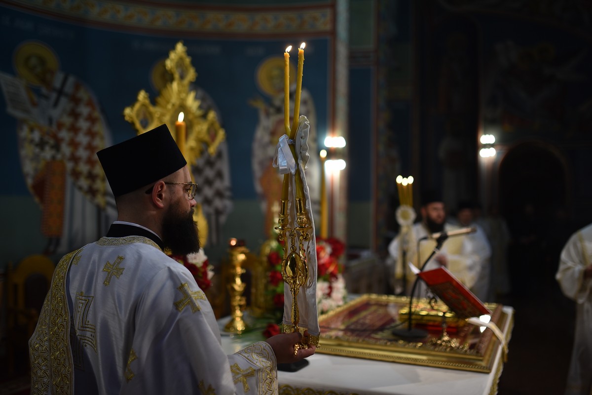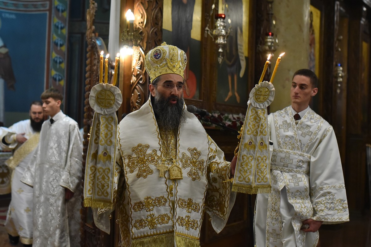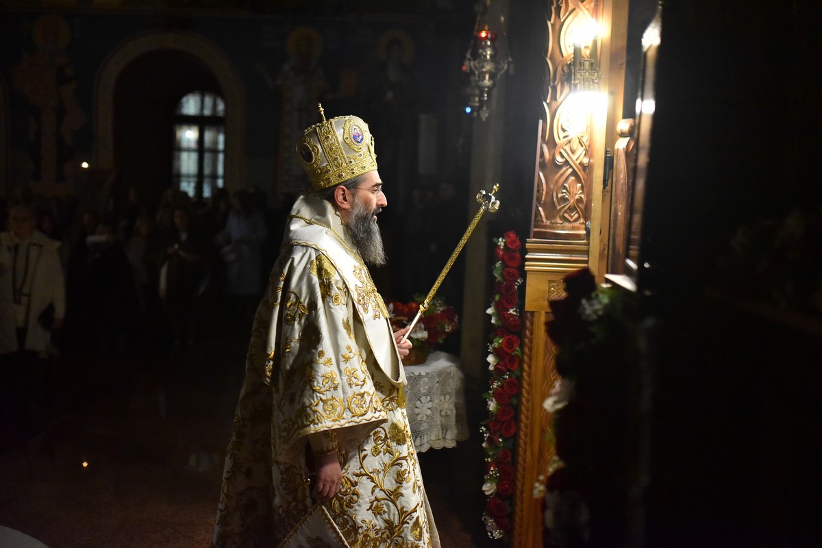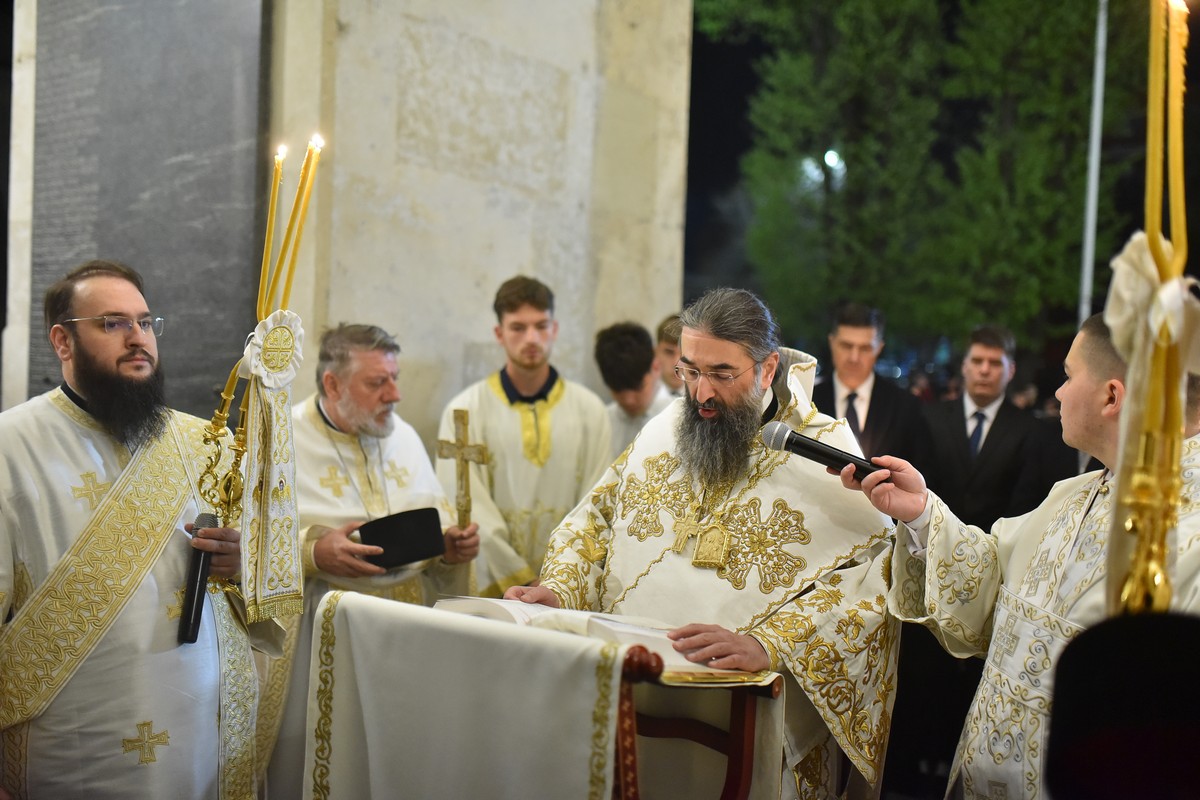 Након појања хвалитних и пасхалних стихира, Високопреосвећени Владика је прочитао празнично слово Светог Јована Златоустог, чему је следио почетак Свете Архијерејске Литургије.