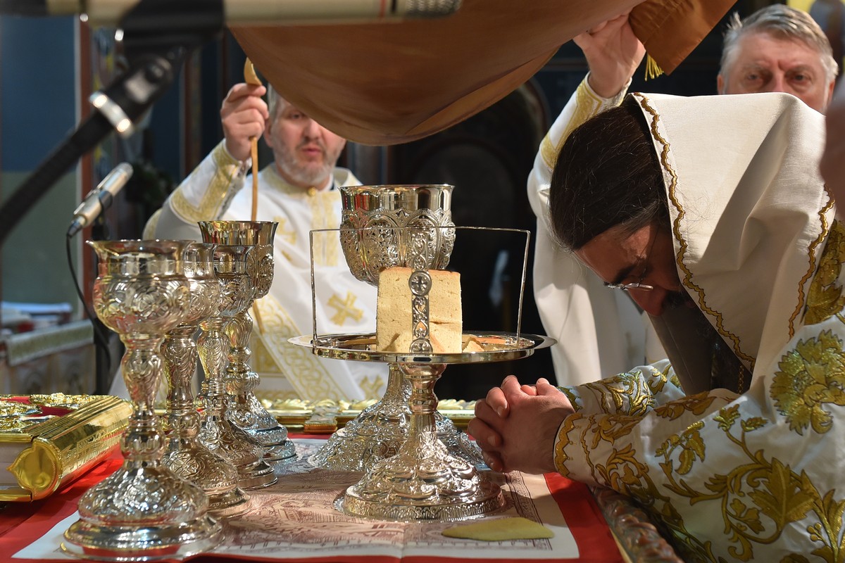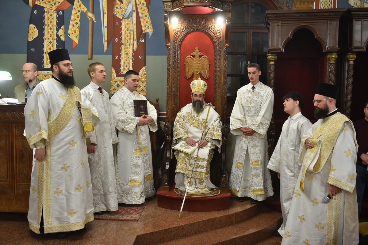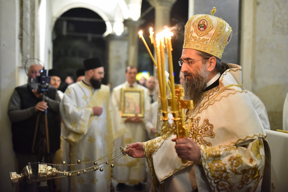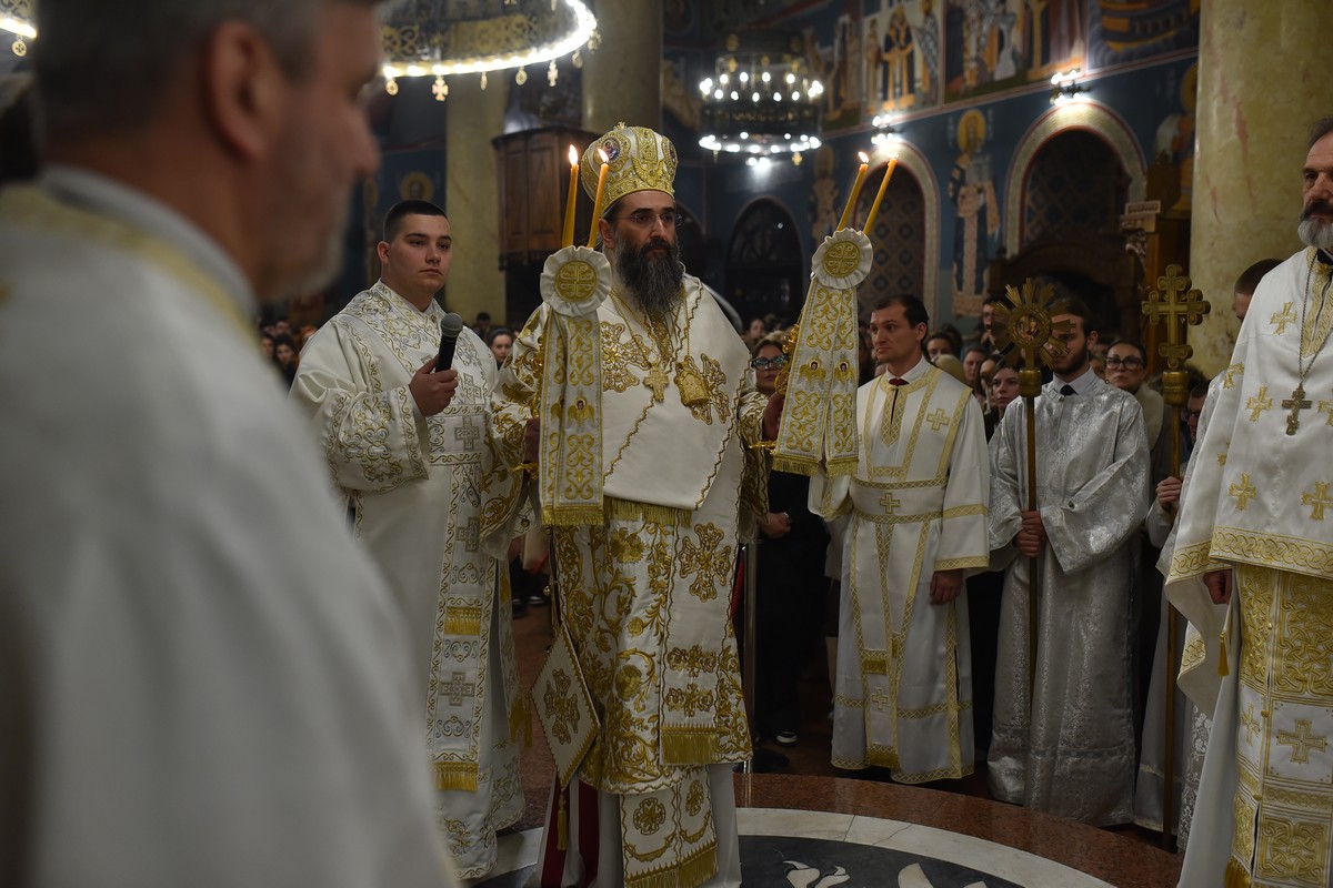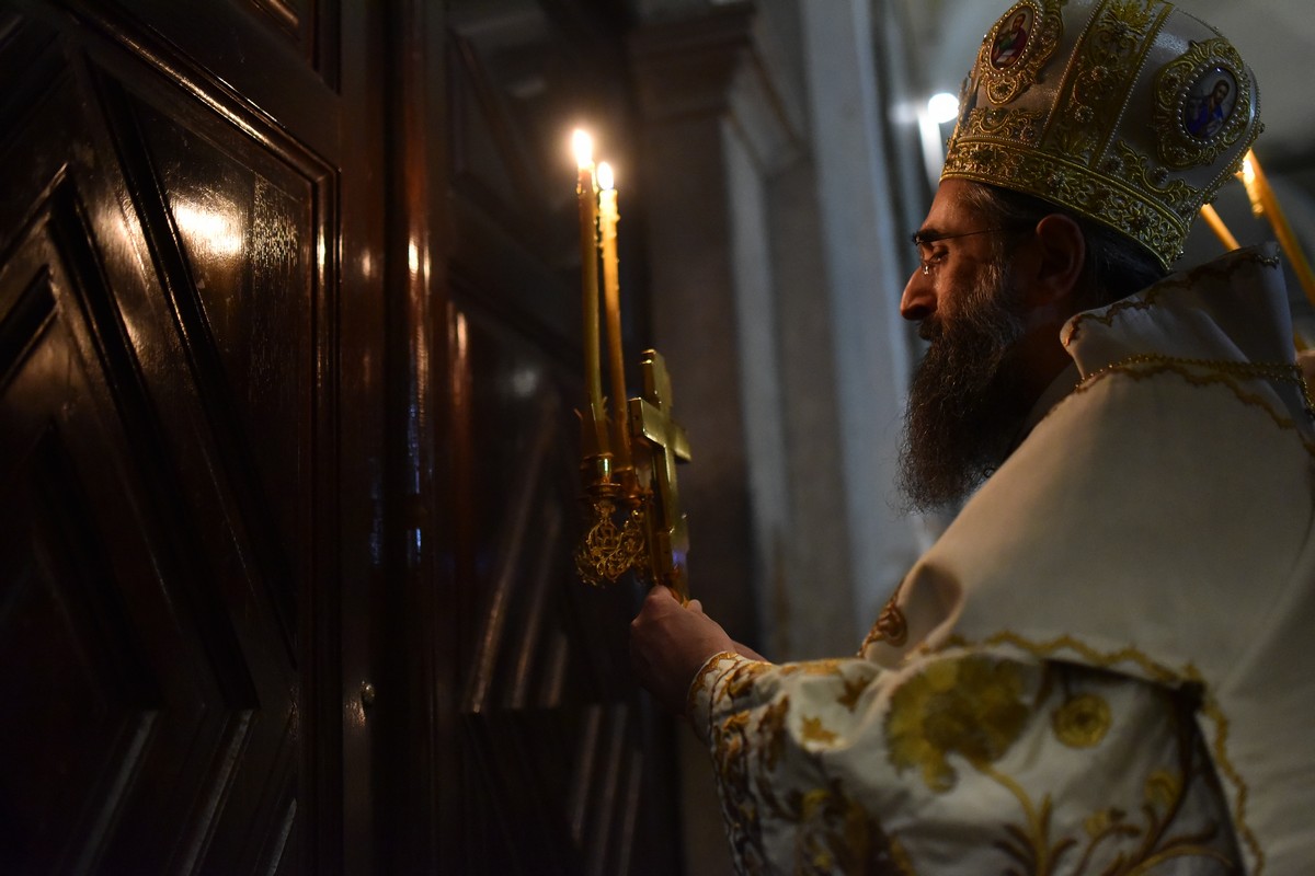 Након појања хвалитних и пасхалних стихира, Високопреосвећени Владика је прочитао празнично слово Светог Јована Златоустог, чему је следио почетак Свете Архијерејске Литургије.