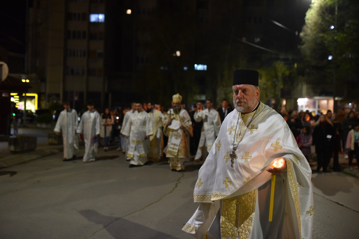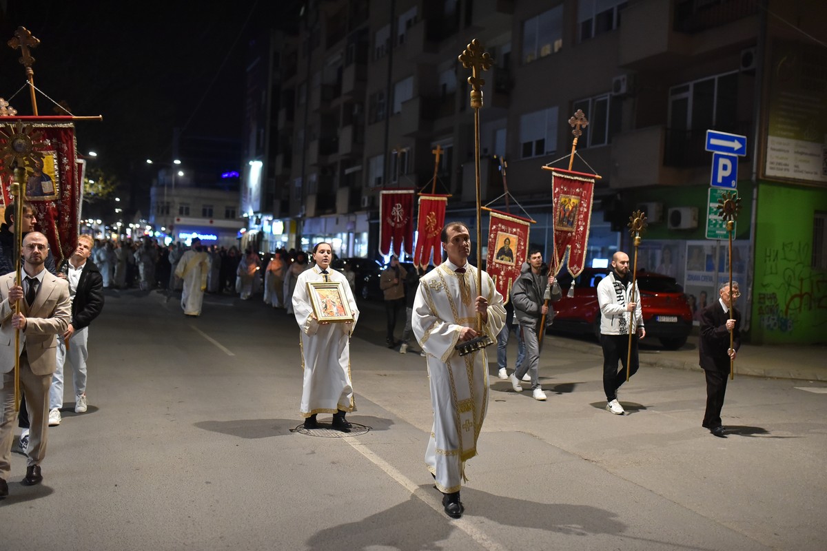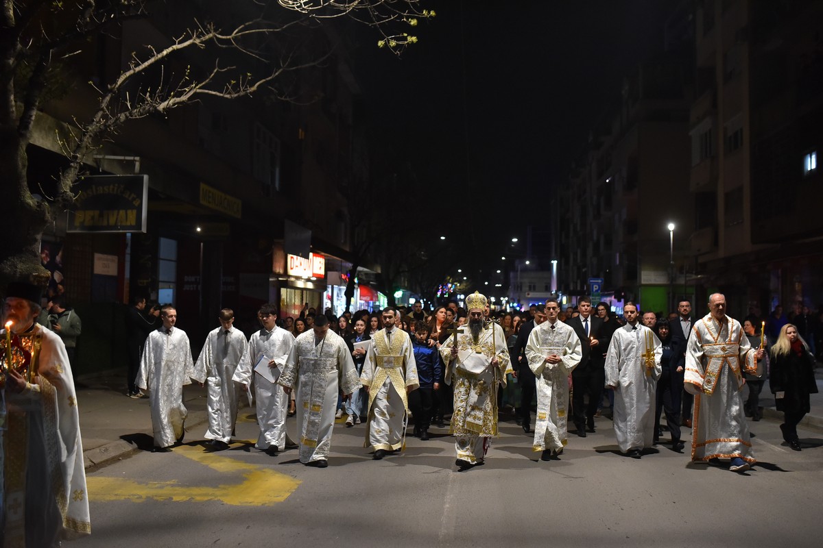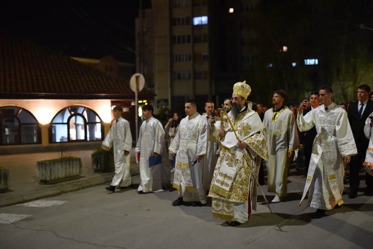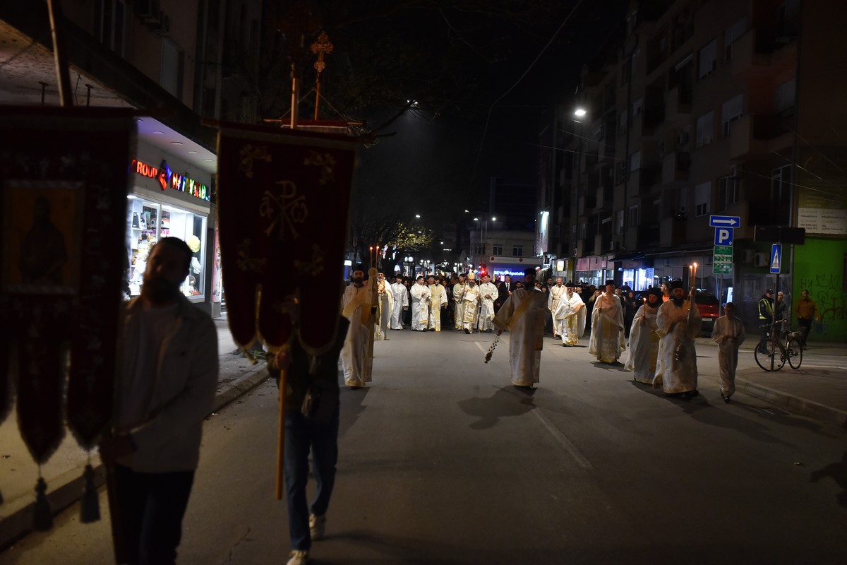 Празнично последовање започето је свечаним изношењем Плаштанице из Гроба Господњег и њеним уношењем у олтар, где ће на Часној Трпези стајати током ових дана радости и торжества. Уследила је величанствена литија, која је, прошавши оближњим градским улицама, окончана повратком у храмовну порту.
