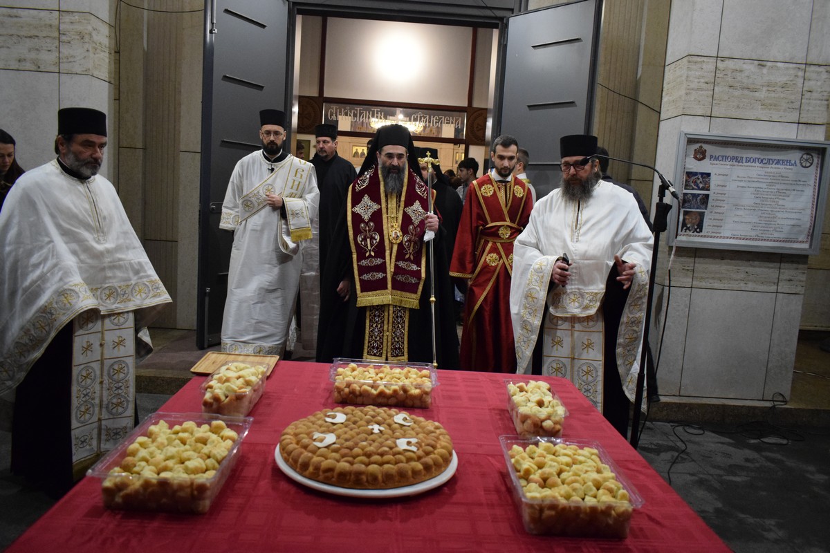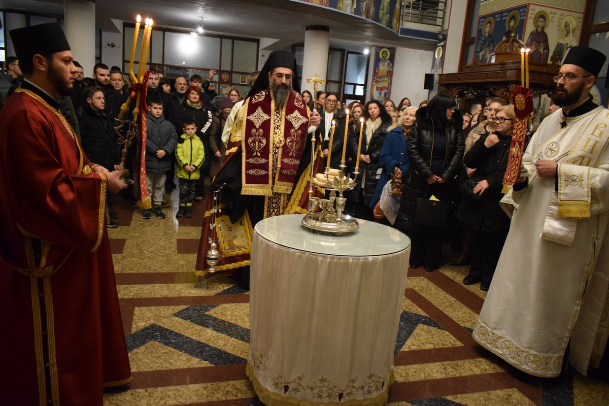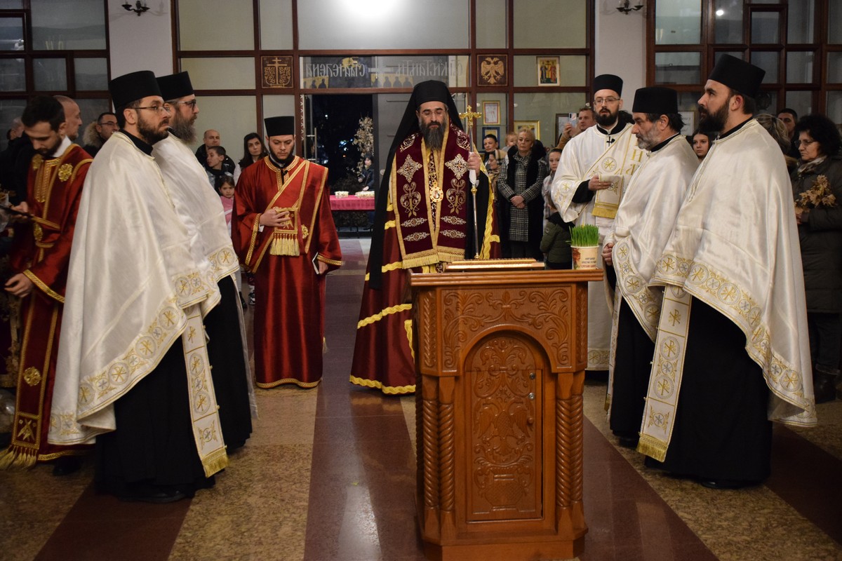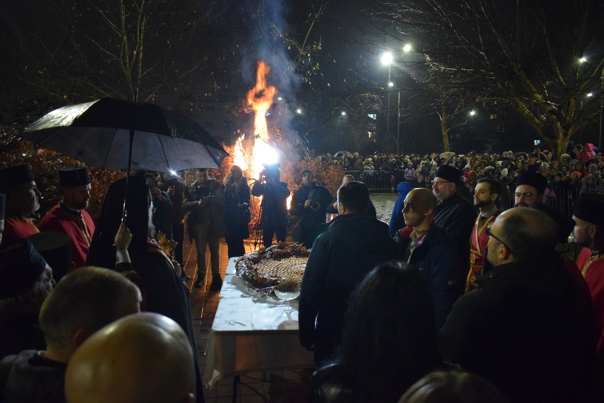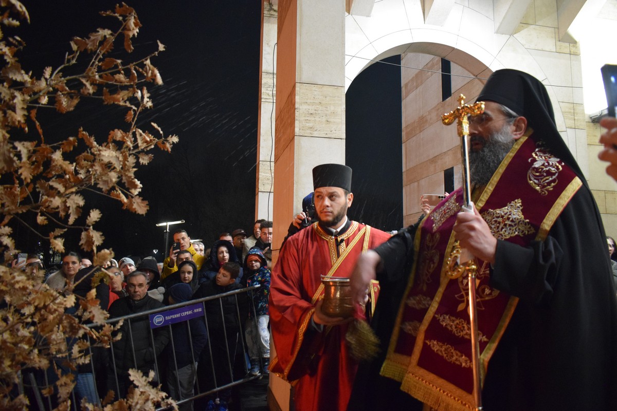 Његово Високопреосвештенство Митрополит нишки г. Арсеније посетио је најпре храм Светог Цара Константина и Царице Јелене, где је, након одслуженог Великог повечерја, благословио бадње дрво и припремљену чесницу. Благосиљању је следило налагање бадњака у храмовној порти.