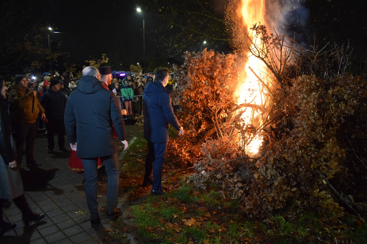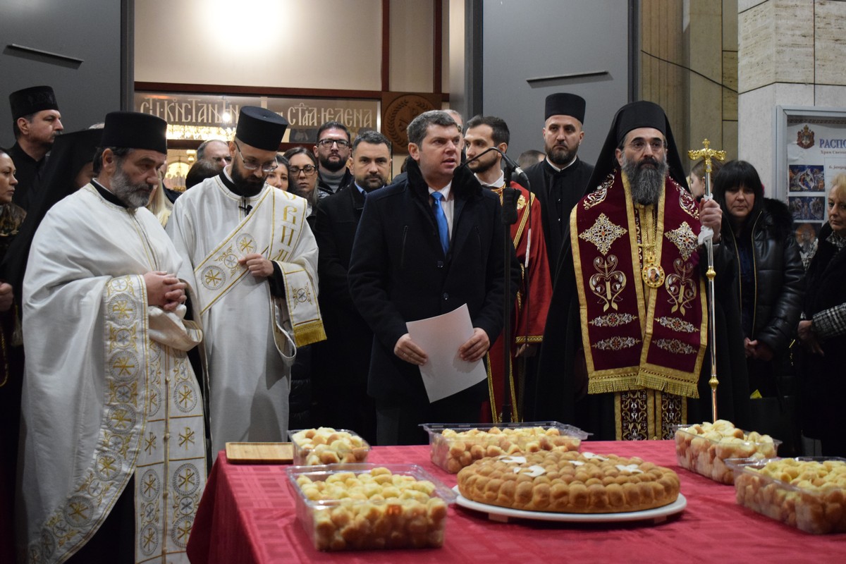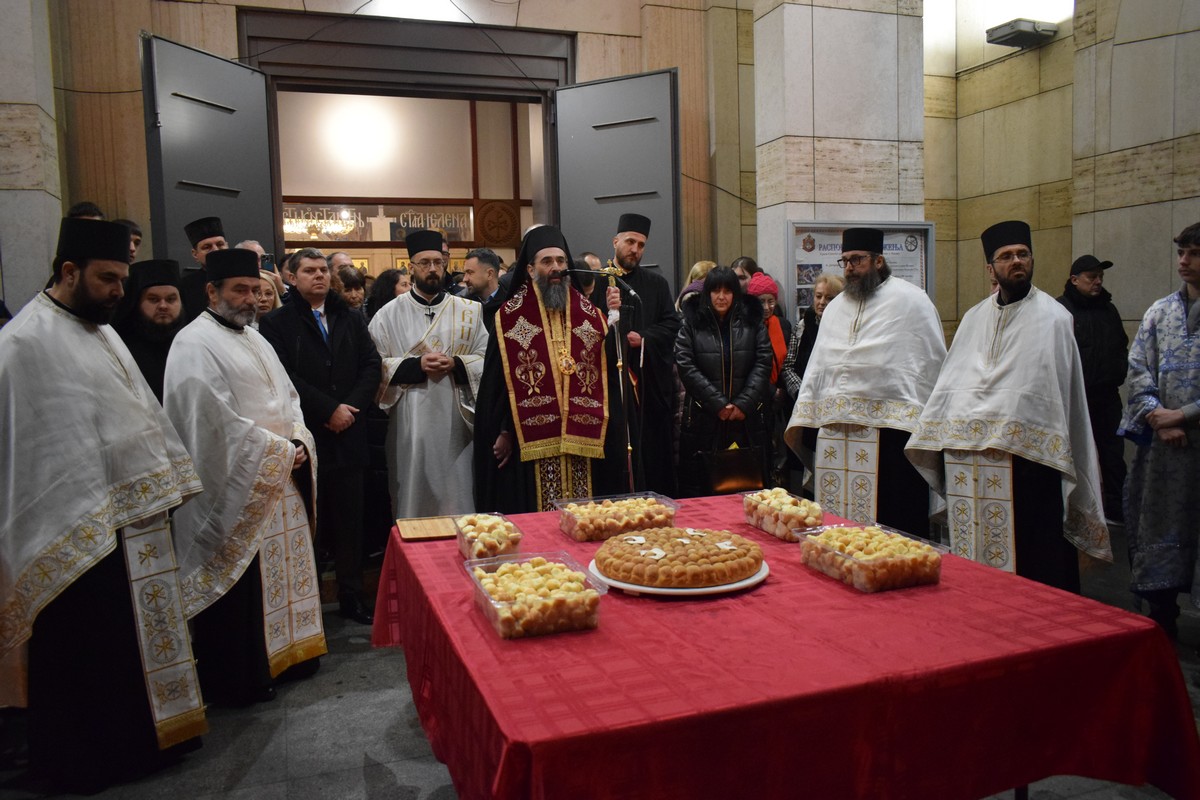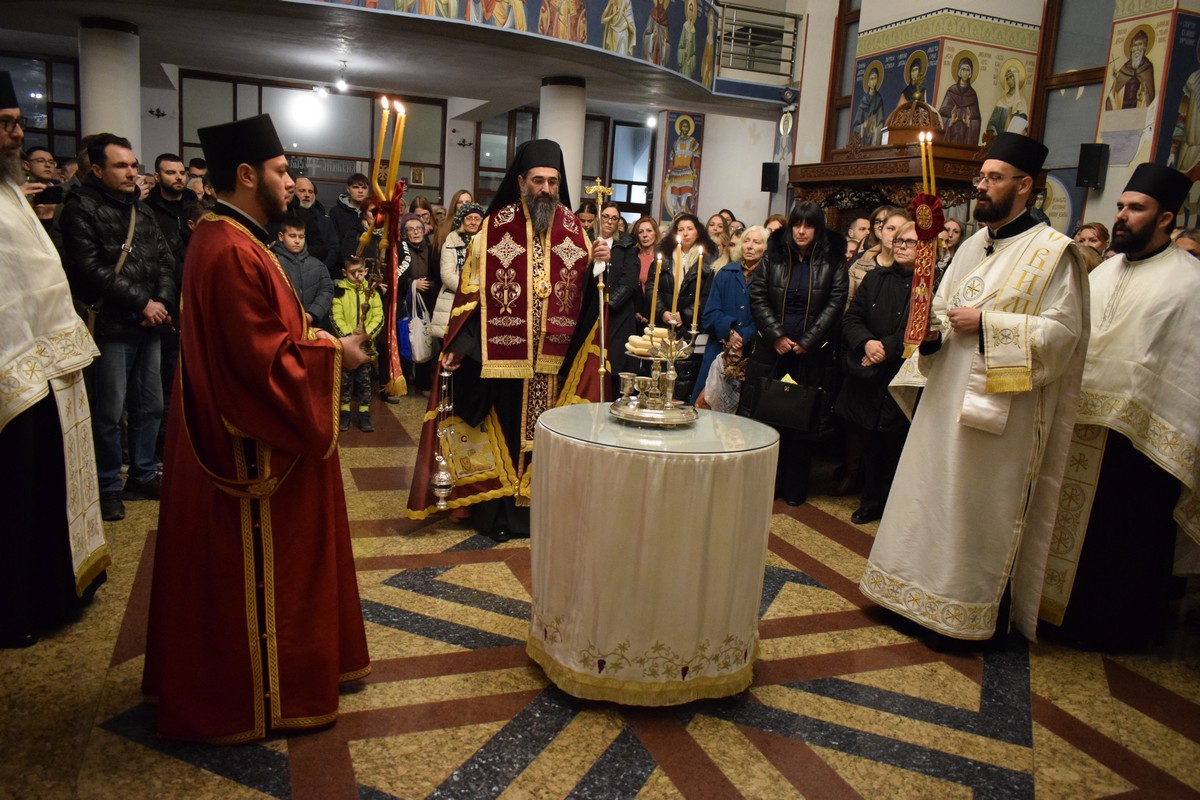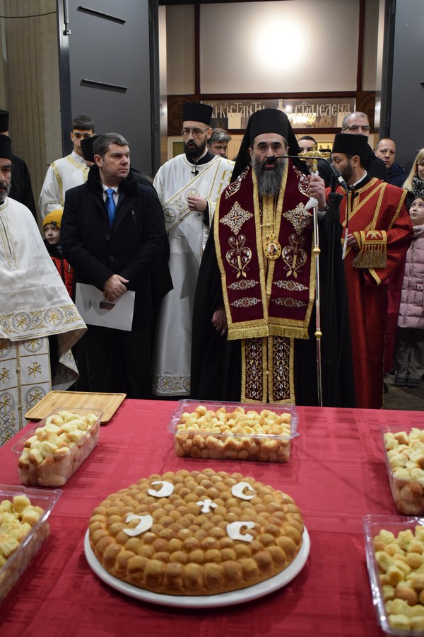 Његово Високопреосвештенство Митрополит нишки г. Арсеније посетио је најпре храм Светог Цара Константина и Царице Јелене, где је, након одслуженог Великог повечерја, благословио бадње дрво и припремљену чесницу. Благосиљању је следило налагање бадњака у храмовној порти.