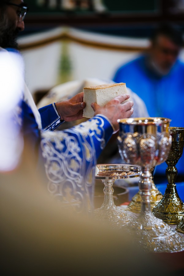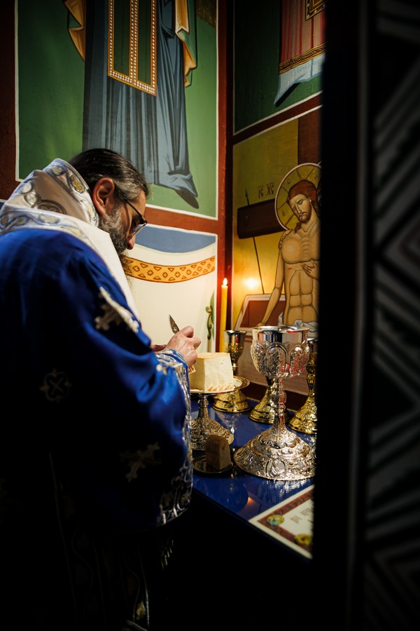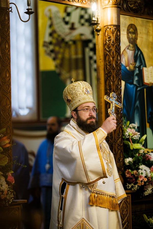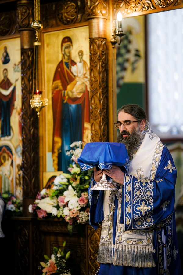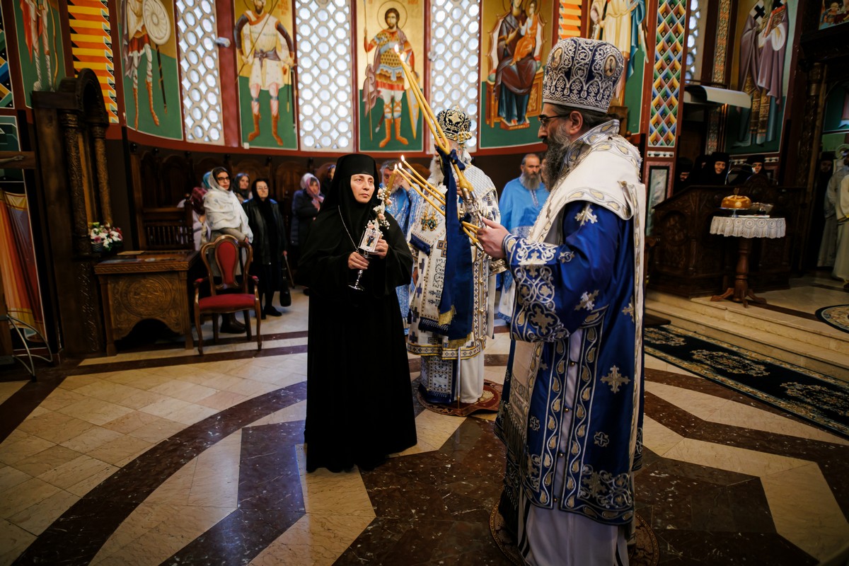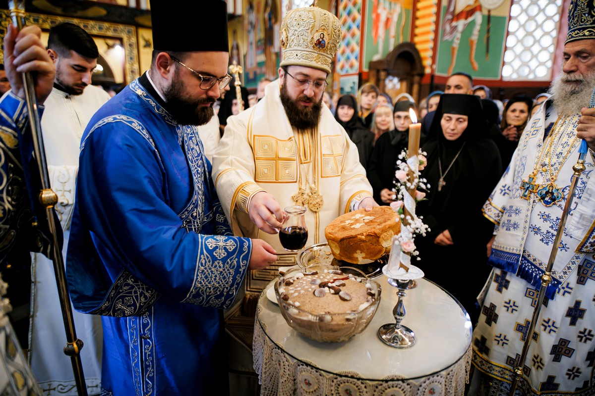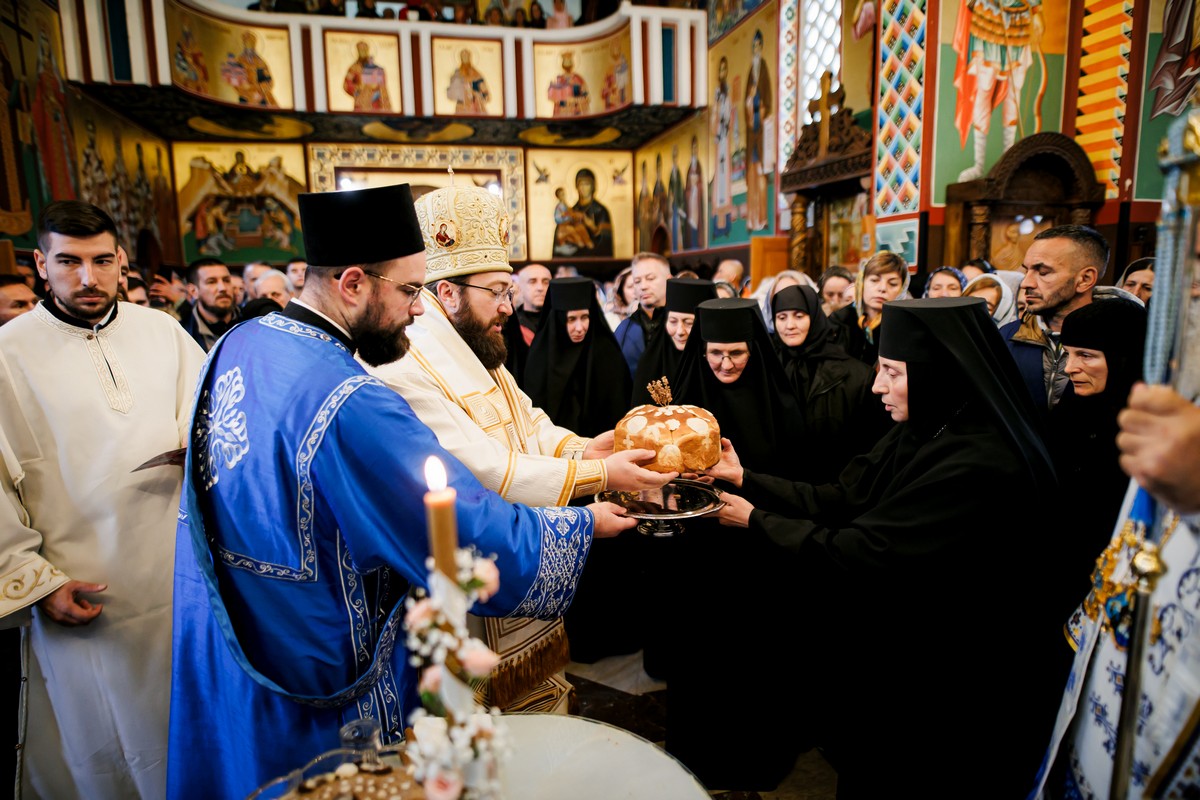 Након заамвоне молитве, Преосвећени Владика Нектарије осветио је славске дарове и пререзао колач, припремљен поводом славе ове свете обитељи.