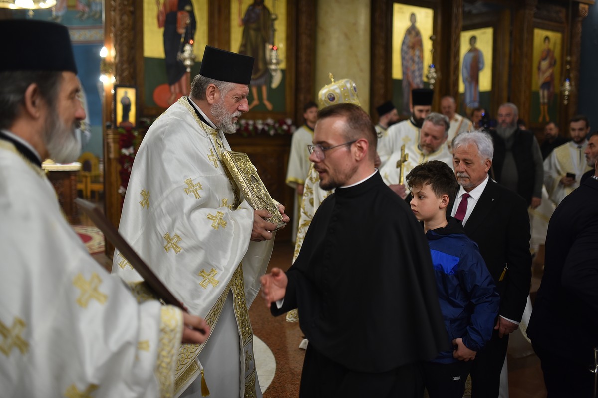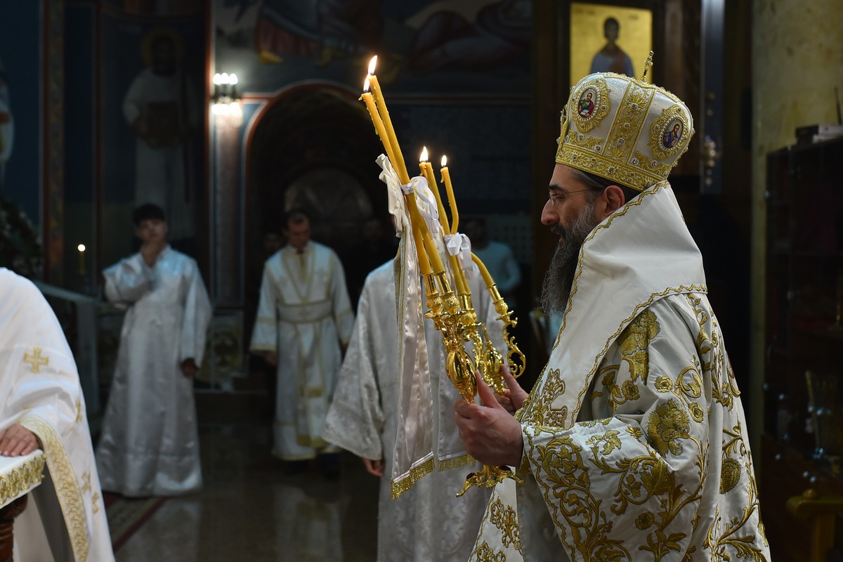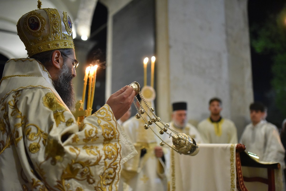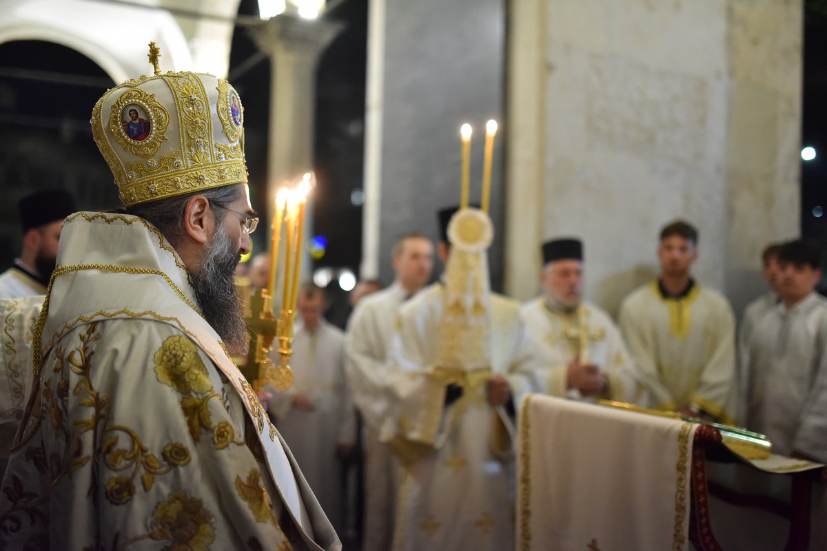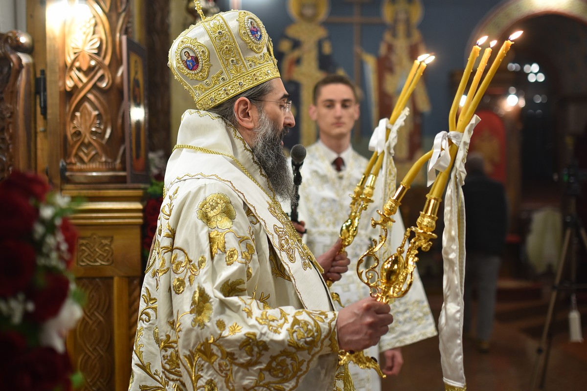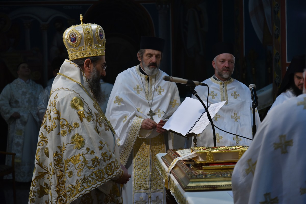 Након појања хвалитних и пасхалних стихира, Високопреосвећени Владика је прочитао празнично слово Светог Јована Златоустог, чему је следио почетак Свете Архијерејске Литургије.