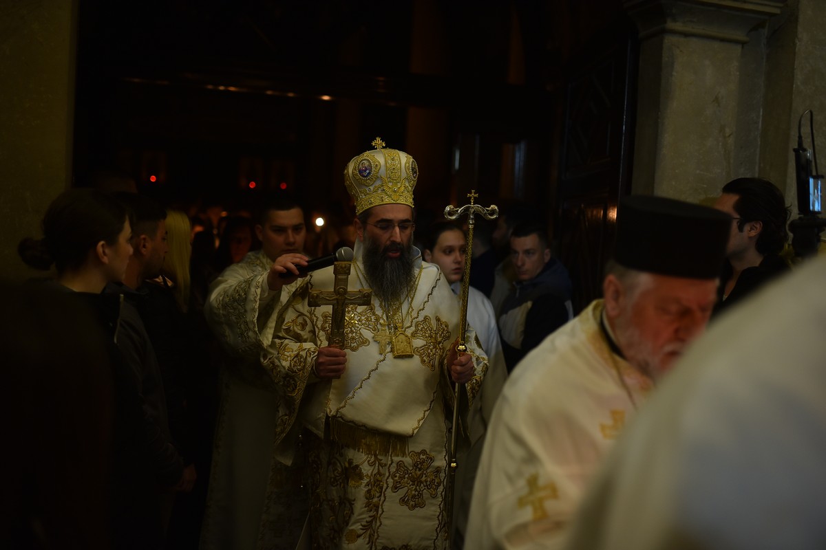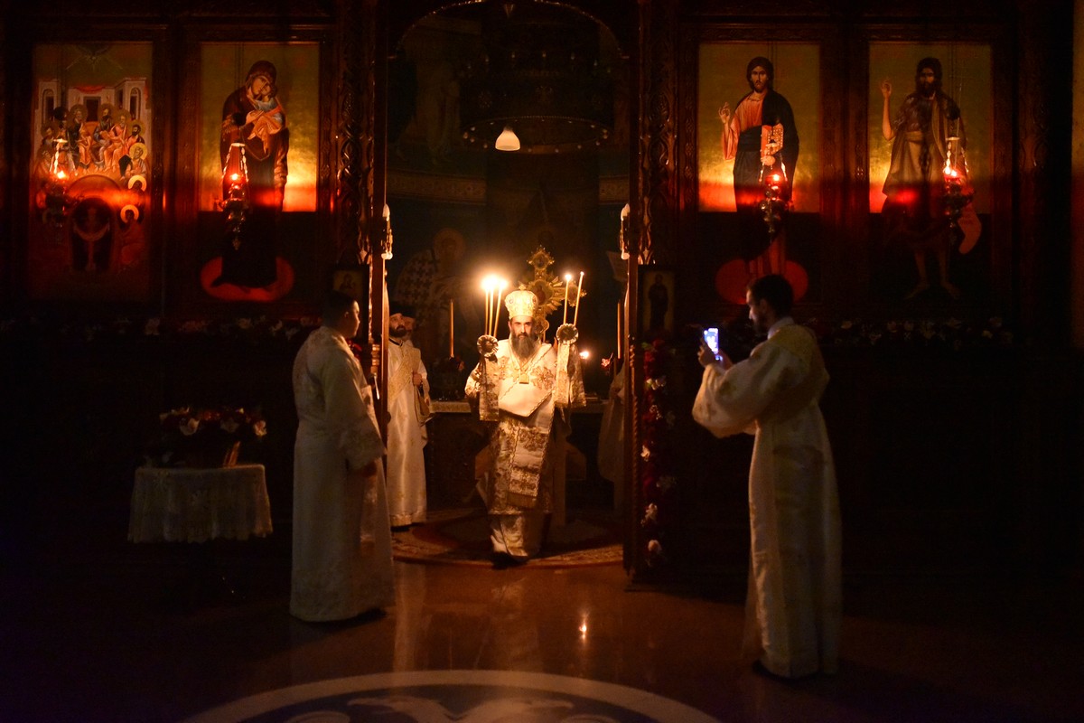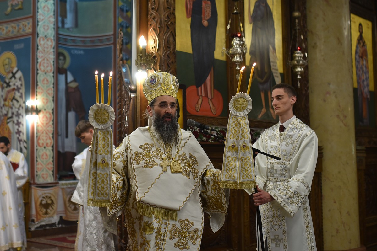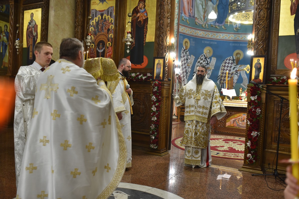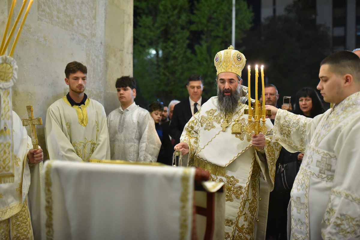 Након појања хвалитних и пасхалних стихира, Високопреосвећени Владика је прочитао празнично слово Светог Јована Златоустог, чему је следио почетак Свете Архијерејске Литургије.