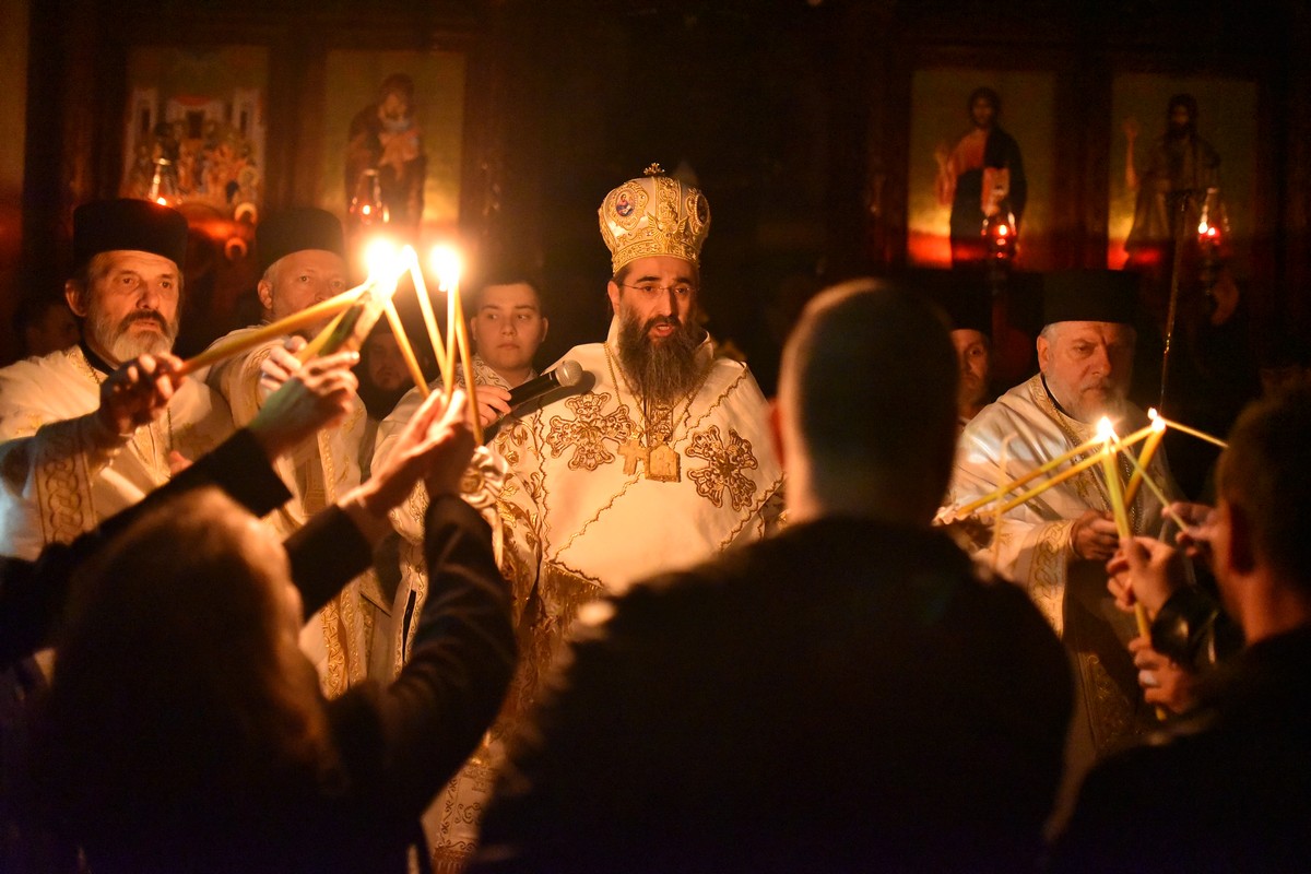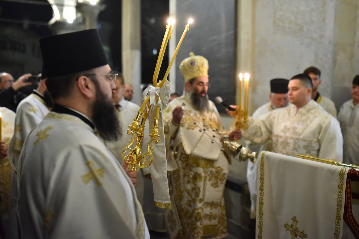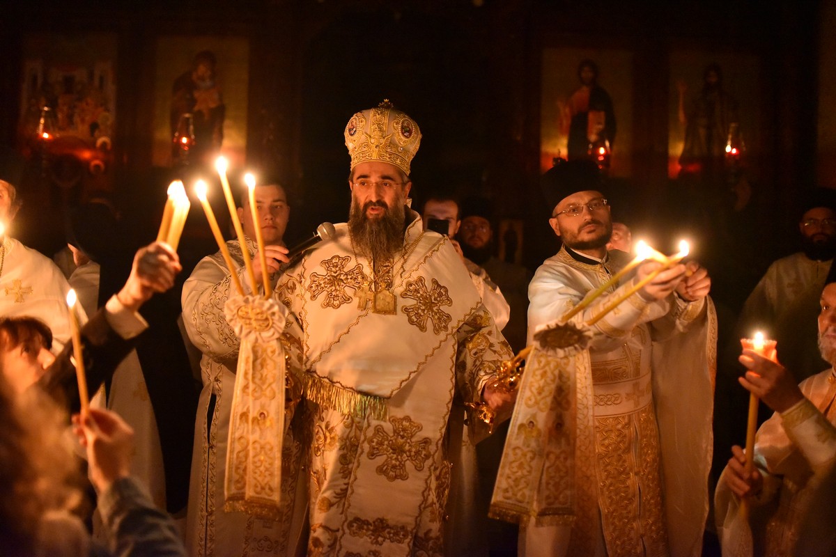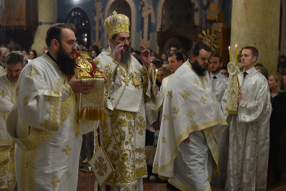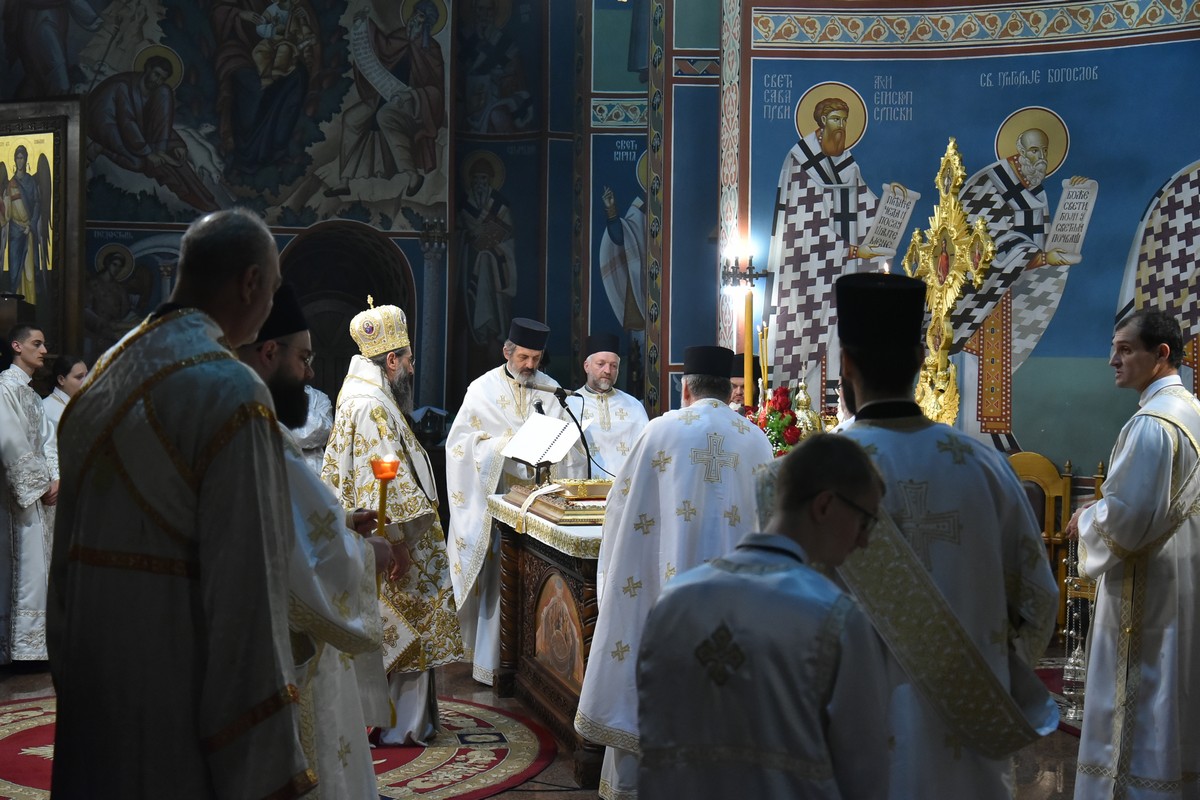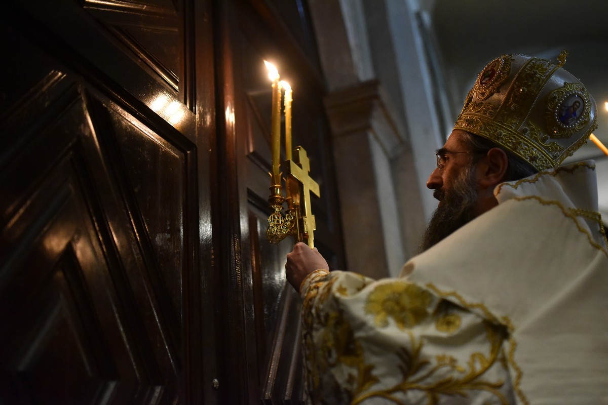 Након појања хвалитних и пасхалних стихира, Високопреосвећени Владика је прочитао празнично слово Светог Јована Златоустог, чему је следио почетак Свете Архијерејске Литургије.