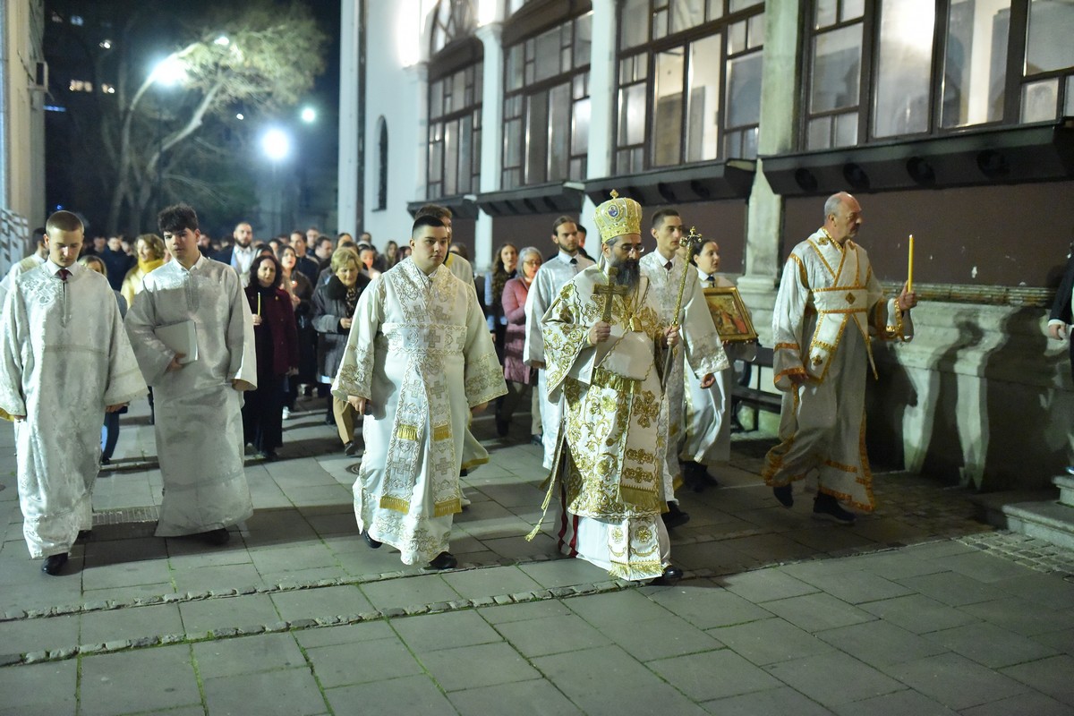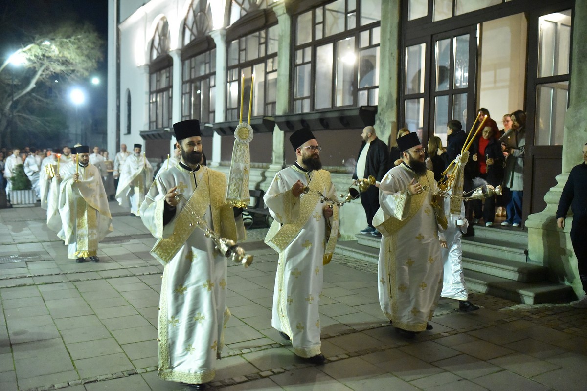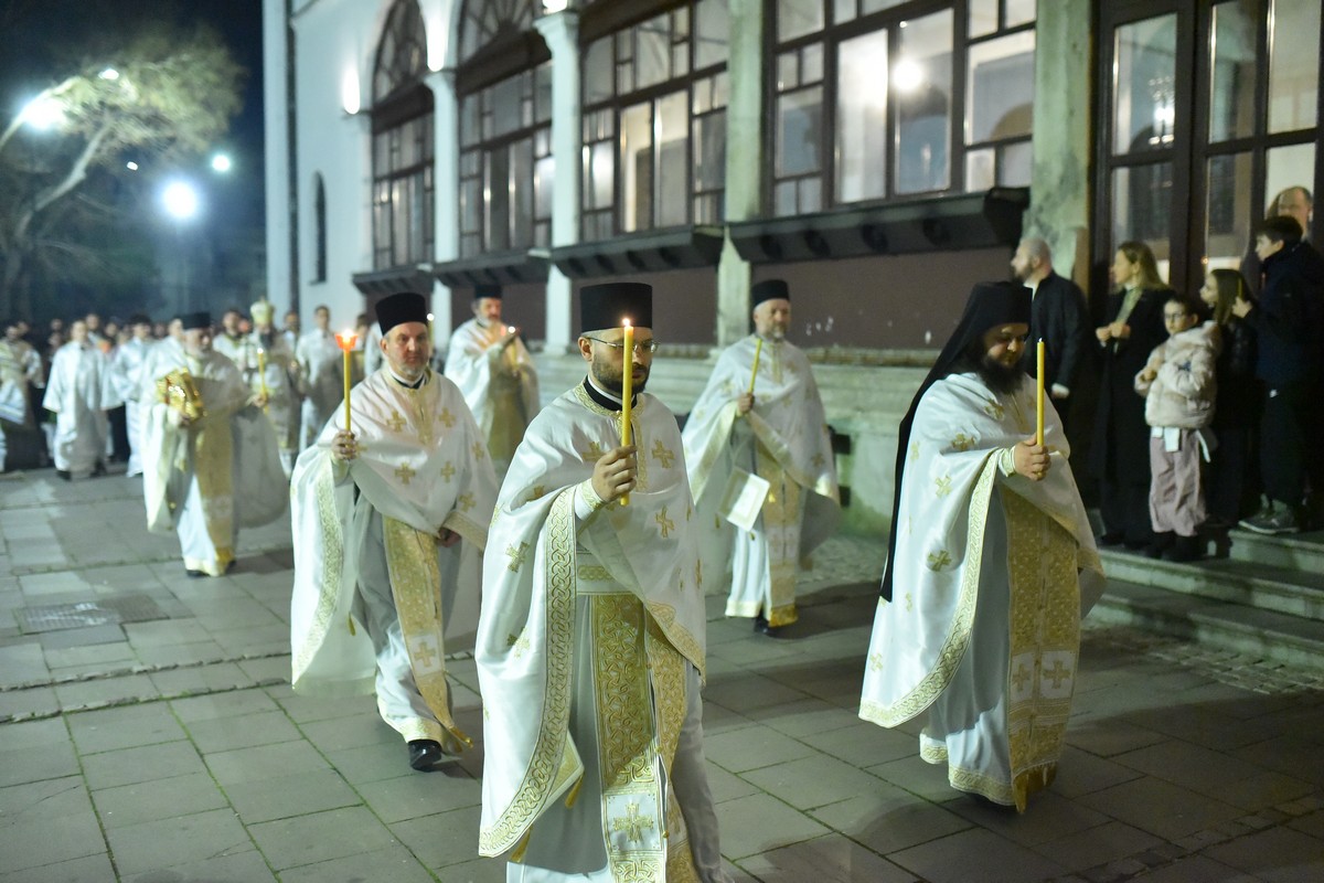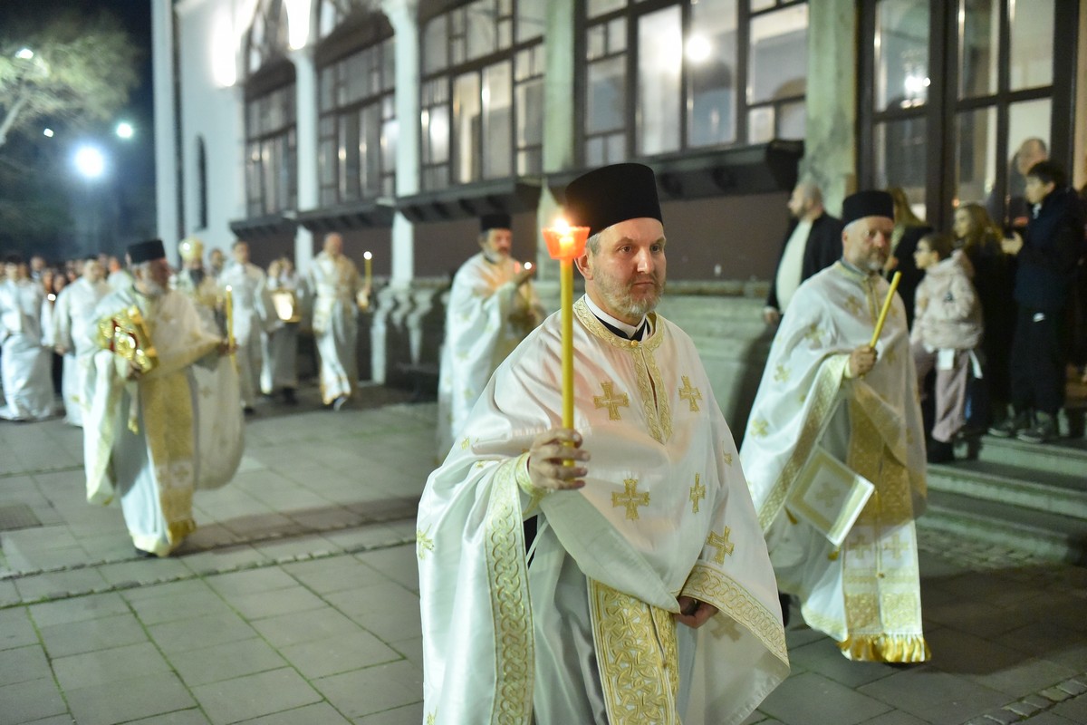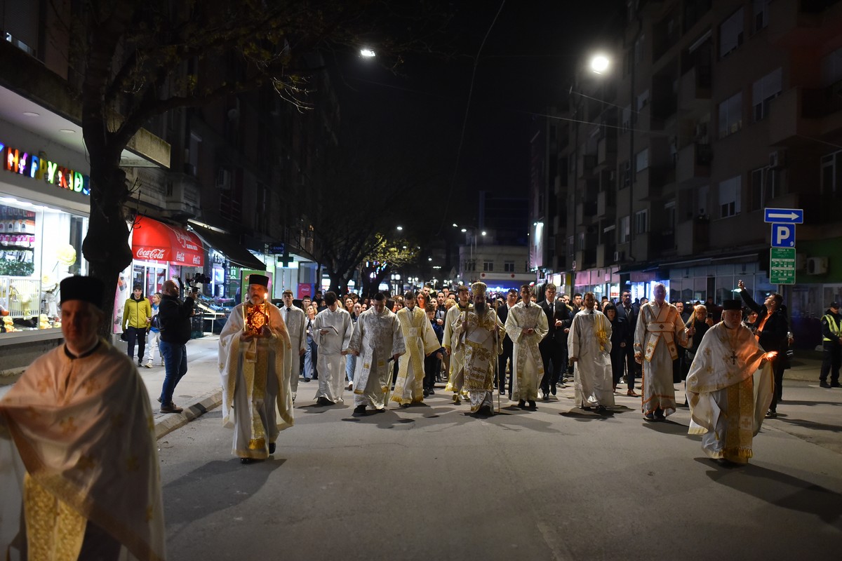 Празнично последовање започето је свечаним изношењем Плаштанице из Гроба Господњег и њеним уношењем у олтар, где ће на Часној Трпези стајати током ових дана радости и торжества. Уследила је величанствена литија, која је, прошавши оближњим градским улицама, окончана повратком у храмовну порту.